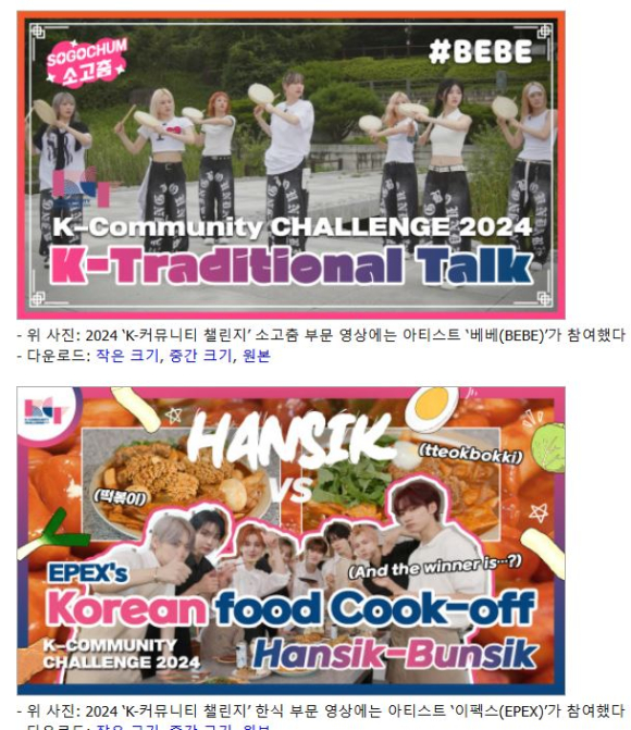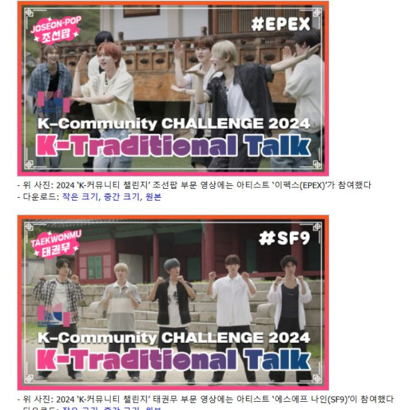‘2024 K-커뮤니티 챌린지’는 △조선팝 △소고춤 △태권무 △한식 4개 부문으로 공모전을 진행한다. 특히 많은 한류 팬들의 호응을 이끌어내기 위해 대중문화 아티스트와 전문가가 직접 참여한 한국문화 강습 영상이 제공된다. 대중문화 아티스트로는 △에스에프나인(SF9) △베베(BEBE) △이펙스(EPEX)가 참여하고, 분야별 전문가(예술인)로는 △악단광칠(조선팝) △태권크리(태권무) △비슬무용단(소고춤)이 함께 했다. 강습 영상은 외국인들이 자연스럽게 한국문화의 매력을 느낄 수 있도록 선정릉, 남산공원, 김포 한옥마을, 선유도 공원 등 전통과 현대를 아우르는 한국의 여러 장소를 배경으로 촬영했다.