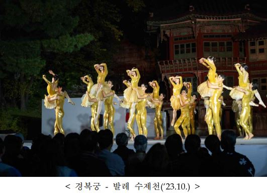 한편, 지난 2022년 첫 선을 보인 ‘고궁음악회-발레×수제천(10.10.~10.13, 집옥재)’도 더욱 풍성하게 찾아온다. 발레와 궁중음악을 접목한 융합(크로스오버, Crossover) 공연으로 호평을 받아온 ‘발레×수제천’은 「 2023 가을 궁중문화축전」 대비 관람 인원(600명→650명)과 관람 횟수(3회→4회)를 늘리고, 외국인 전용 좌석을 추가하여 보다 많은 이들이 즐길 수 있도록 기획했다.(내외국인 모두 사전 예약 필요) * ‘고궁음악회-발레×수제천’ 외국인 회차: 크리에이트립(creatrip.com) 통해 예매(9.5.~)