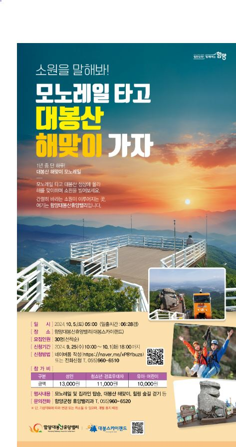 함양대봉산휴양밸리, 모노레일과 함께 대봉산 해맞이 행사 개최!오는 10월 5일 오전 5시 행사 진행, 신청은 9월 25일 오전 10시부터 선착순 모집김주영 기자 / |