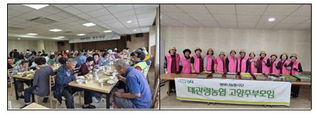 | □ 고향주부모임 대관령분회, 대관령면 장수식당 운영 ੦ 어제(9.26.), 고향주부모임 대관령분회(회장 손정순) 회원 13은 대관령면 복지회관에서 장수식당을 운영하여 대관령면번영회장이 후원한 떡과 함께 어르신 140분께 점심식사를 대접하였음.