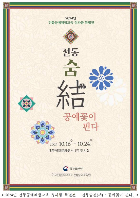 국가유산청 한국전통문화대학교 전통문화교육원(원장 김용구)은 10월 16일부터 10월 24일까지 대구생활문화센터 전시실(대구 만촌동)에서 2024년 전통공예체험교육 성과품 특별전 「전통숨결(結) : 공예꽃이 핀다」를 개최한다.