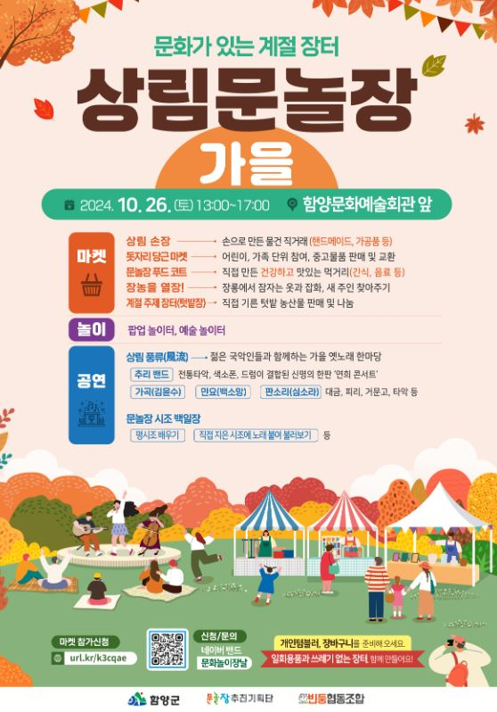 함양군은 빈둥협동조합(대표 김찬두)과 함께 오는 10월 26일(토) 오후 1시부터 5시까지 함양문화예술회관 앞마당에서 문화가 있는 날 행사로 상림 문화놀이장날 ‘가을 단풍물들장’을 개최한다고 밝혔다.