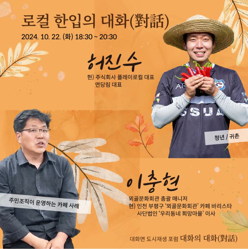 오는 22일에는 「로컬 한입의 대화」라는 주제 2차 포럼이 진행되며, 인구소멸 위기 지역인 경북 영양군에서 숙박시설과 카페를 운영하는 허진수 연당림 대표와 주민조직단체가 운영하는 인천 뫼골문화회관의 이충현 매니저를 초빙하여 사례를 공유하는 자리를 갖는다.