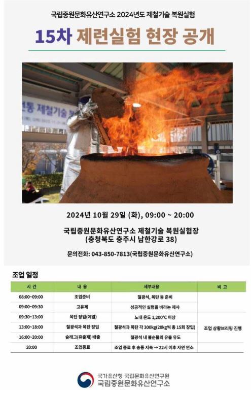 국가유산청 국립문화유산연구원 국립중원문화유산연구소(소장 조상순, 이하 ‘중원연구소’)는 10월 29일부터 11월 17일까지 중원연구소(충북 충주시)에서 2014년부터 꾸준히 하고 있는 제철기술 복원실험의 과정과 성과를 국민들과 공유하기 위한 「전통제철 체험 프로그램」을 진행한다.