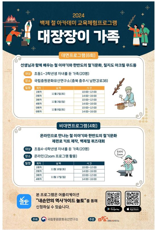 | 가족 체험형 프로그램인 ‘백제 철 아카데미’는 11월 2일부터 11월 17일까지 주말에만 운영되며, 대면(중원연구소 내 제철기술 복원실험장 무쇠네 대장간 / 11.2~3, 11.9.)과 비대면 프로그램(온라인 ZOOM / 11.16~17.)으로 구성된다.