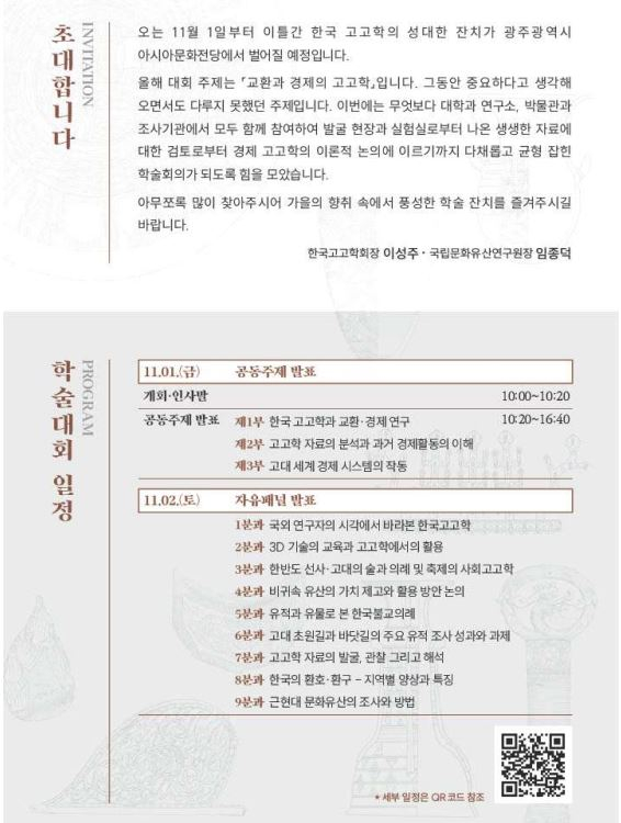 - ‘교환과 경제의 고고학’ 주제로 제48회 한국고고학전국대회 개최(11.1.~2, 광주 국립아시아문화전당)