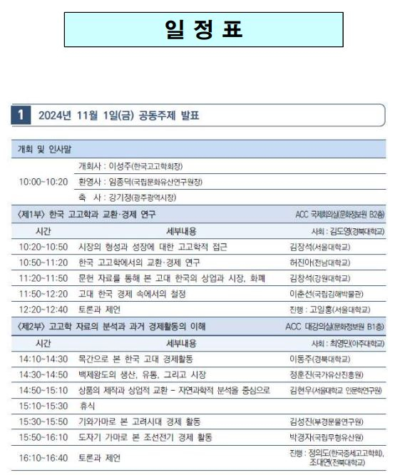| 첫째 날인 11월 1일에는 3개의 분과(세션)별 주제발표가 진행된다. 오전에는 ▲ 고대 한국 경제의 발전과 변화 과정을 문헌 자료와 당시 화폐 역할을 했던 철정(덩이쇠, 鐵鋌)을 통해 분석해보는 ‘한국 고고학과 교환·경제 연구’(4개 주제발표)가 진행된다. 오후에는 고고학 자료들을 통해 고대 경제활동 양상을 알아보는 ▲ ‘고고학 자료의 분석과 과거 경제활동의 이해’(5개 주제발표)와 ▲ ‘고대 세계 경제 시스템의 작동’(5개 주제발표)이 동시에 진행된다. 각 분과별 발표가 끝난 후에는 종합토론이 펼쳐진다.