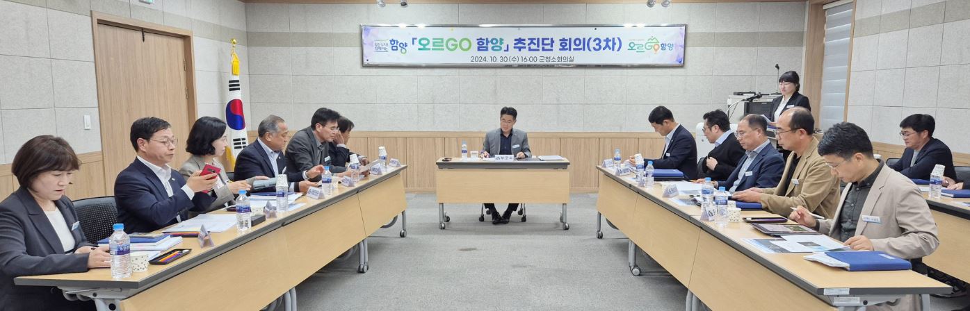 함양군은 10월 30일 오후 군청 소회의실에서 조여문 부군수를 중심으로 담당 국장 및 부서장 등 16여 명이 참석한 가운데 ‘오르고(GO) 함양’ 추진단의 세 번째 회의를 개최해 사업 준비 상황을 점검했다.