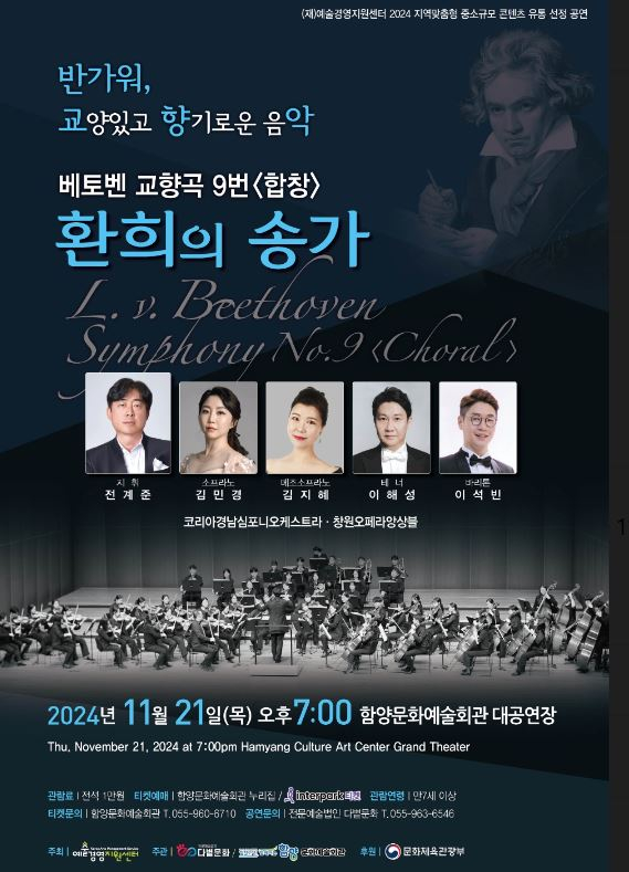 함양군, 베토벤 교향곡 9번 <합창> ‘환희의 송가’ 공연 개최㈜다볕 주관 11월 21(목) 오후 7시 함양군문화예술회관 대공연장정호 기자 / |