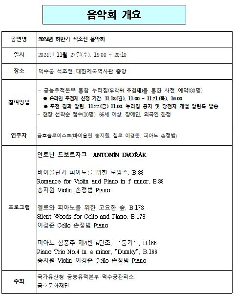 국가유산청 궁능유적본부 덕수궁관리소(소장 권점수)는 금호문화재단(대표 서재환)과 함께 11월 27일 오후 7시 덕수궁 석조전(서울 중구)에서「2024년 하반기 석조전 음악회」를 개최한다.