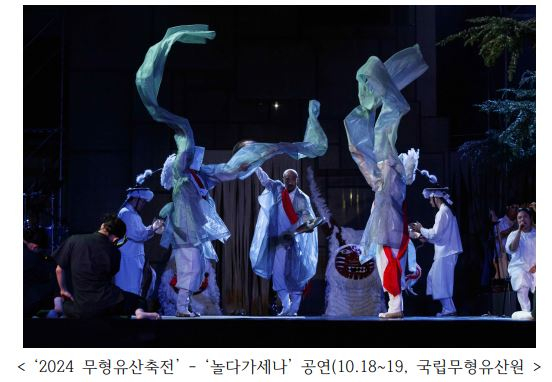 | 「놀다가세나」는 한국 무형유산 공동체의 가치와 보유자의 삶을 공연으로 녹여낸 작품으로, 전통 연희(승무, 탈춤, 고성오광대 등)와 전통 음악(범패, 별신굿 등)이 현대 음악 및 춤사위와 결합한 무대이다. 앞서, 지난달 개최됐던 「2024년 무형유산축전, ‘화락연희’」를 통해 국내에서 첫 선을 보인 바 있다.