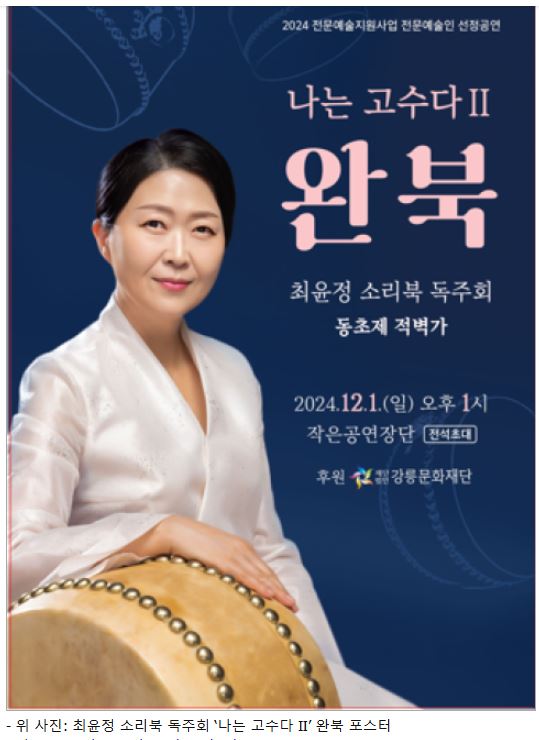 판소리고법 이수자 최윤정 고수는 오는 12월 1일(일) 오후 1시 강릉에 위치한 작은공연장 단에서 완북 동초제 적벽가 ‘나는 고수다 Ⅱ’ 완북 소리북 독주회를 개최한다고 밝혔다.