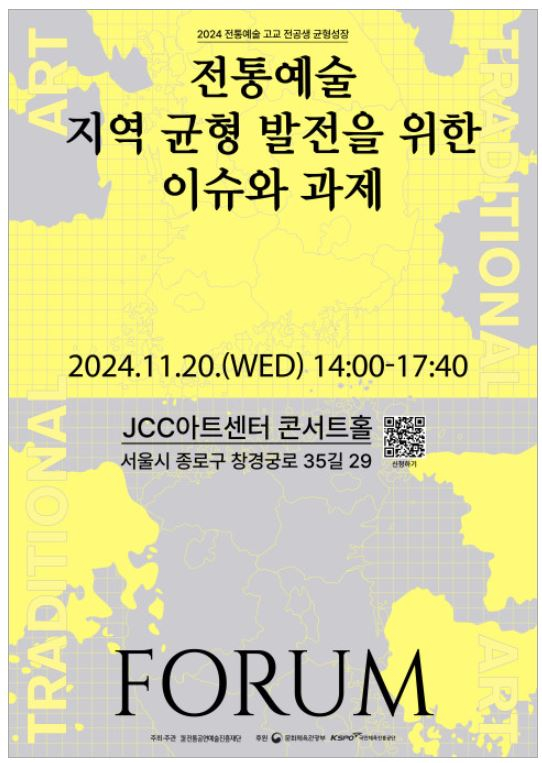 2024년 11월 15일 -- 전통공연예술진흥재단(이사장 김삼진)은 지역 전통예술 생태계 분석과 지역인재 지원 방안을 모색하기 위한 ‘전통예술 지역 균형 발전을 위한 이슈와 과제’ 포럼을 오는 11월 20일 JCC아트센터 콘서트홀에서 개최한다.