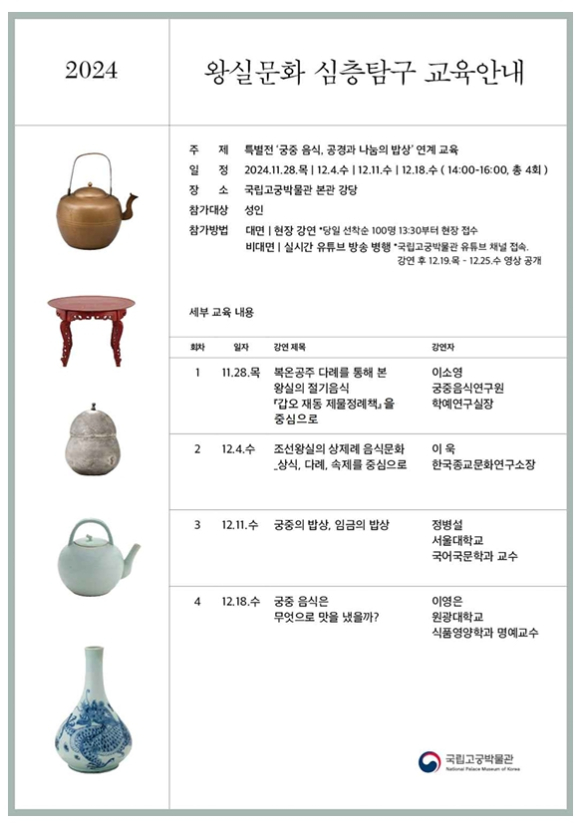 - 국립고궁박물관, ‘궁중 음식, 공경과 나눔의 밥상’ 특별전 연계 「왕실문화 심층탐구」 교육 운영(총 4회)