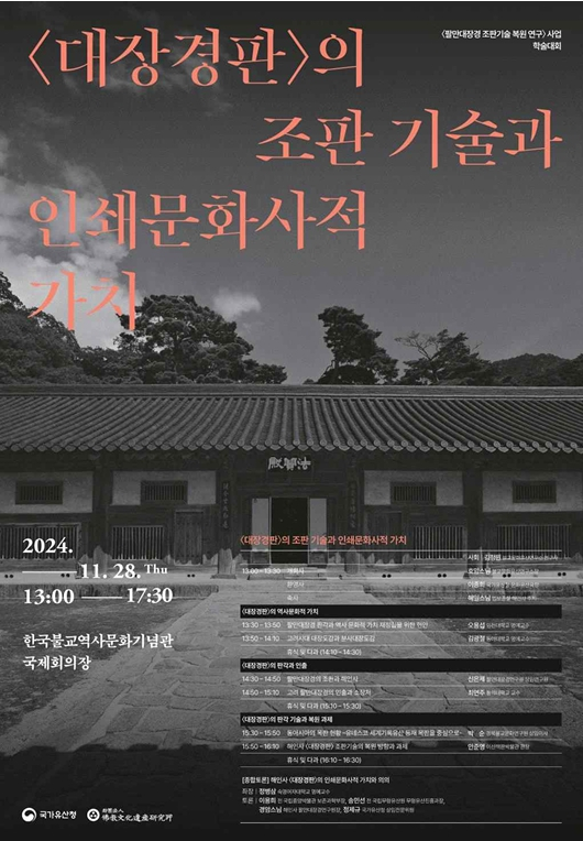 주제발표 이후에는 숙명여자대학교 정병삼 명예교수 등 관계 전문가들이 대장경판의 인쇄문화사적 가치와 의의에 대한 종합토론을 진행할 예정이다.