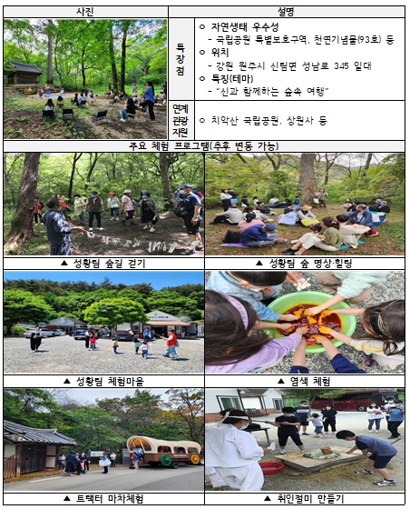 환경부는 2013년부터 우수한 자연환경을 보호하고 지역 발전의 핵심 축으로 활용하기 위해 국가생태관광지역 지정제도를 운영하고 있으며, 올해 신규 지정 지역으로 ‘원주시 성황림 및 성황림마을’을 선정했다고 밝혔다. 원주 성황림마을은 강원특별자치도에서 7번째로 지정된 생태관광지역으로, ‘신들의 숲’으로 불리는 성황림은 천연기념물(제93호)로 지정되어 있으며, 국립공원 특별보호구역으로 관리되고 있다. 성황림은 훼손되지 않은 자연환경을 고스란히 간직하고 있는 전통적인 식생의 보고로, 생태적 가치가 매우 높은 지역으로 평가받고 있다.