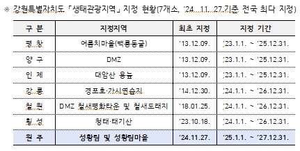 이번 신규 지정으로 강원특별자치도(도지사 김진태)는 전국에서 가장 많은 생태관광지역을 보유하게 되었으며, 풍부한 자연 생태자원의 우수성과 지속 가능한 생태관광 모델로서의 가치를 다시 한번 입증한 성과로 평가된다. 강원특별자치도와 원주시는 도 생태관광협의회와 함께 성황림 및 성황림마을의 생태관광자원을 활용하여 방문하는 관광객들에게 자연 생태적 보전가치에 대한 인식을 높이고, 이를 바탕으로 자연 보호 활동 연계 프로그램의 참여율을 증대시킬 계획이다. 또한, 지역 주민의 참여를 통해 프로그램 전문가를 육성하고 일자리를 창출하여 지역 경제 활성화에도 기여할 예정이다. ※ (사)강원특별자치도생태관광협의회(대표 김정하) / 2022.12.14.설립 / 회원 109명 안중기 강원특별자치도 산림환경국장은 “강원도가 보유한 청정 생태자원의 가치를 널리 알리고, 이를 현명하게 활용하기 위해 시군, 도 생태관광협의회, 민간과 협력하여 ‘1시군 1생태관광지역’ 지정을 목표로 지속적으로 확대할 계획”이라고 밝혔다.