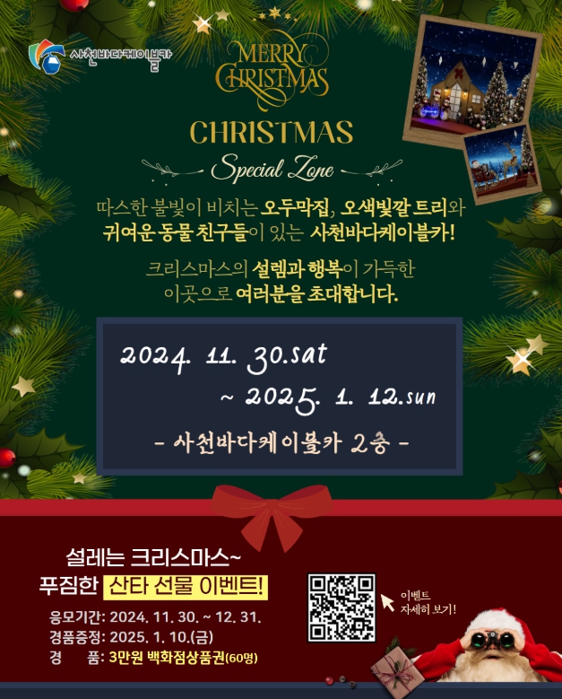 사천바다케이블카, ‘크리스마스 스페셜존’ 오픈- 내년 1월 12일까지 운영...오색빛깔 트리·오두막집 등 눈길 -- 방문객 대상 SNS 인증샷 이벤트 실시 - 정호 기자 / |