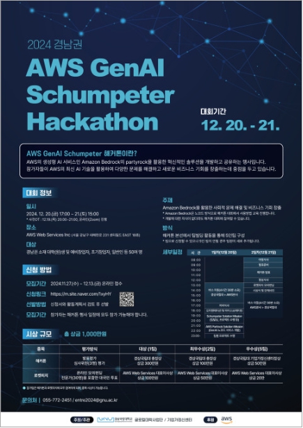2024년 12월 2일 -- 경상국립대학교(총장 권진회)가 글로컬대학 사업단과 기업가정신센터 주관으로 오는 12월 20일부터 21일까지 서울 강남구 AWS Web Services 본사에서 ‘2024 경남권 AWS GenAI Schumpeter Hackathon’을 개최한다. 이번 행사는 최신 AI 기술을 활용해 사회적 문제를 해결하고 새로운 비즈니스 기회를 발굴하는 것을 목표로 하며, 총상금 1000만원과 다양한 수상의 영예가 주어진다.