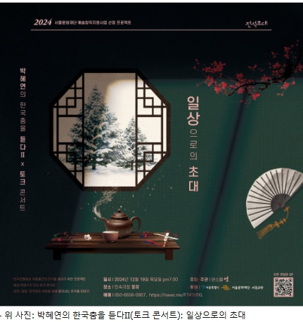 2024년 12월 5일 -- 전통 무용가 박혜연이 오는 12월 19일 목요일 오후 7시 국가무형유산전수교육관 민속극장 풍류에서 ‘박혜연의 한국춤을 듣다Ⅱ(토크 콘서트): 일상으로의 초대’를 개최한다.