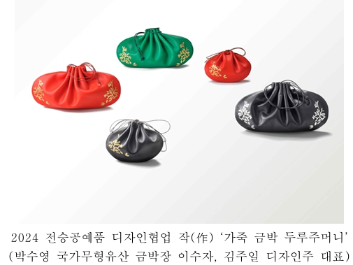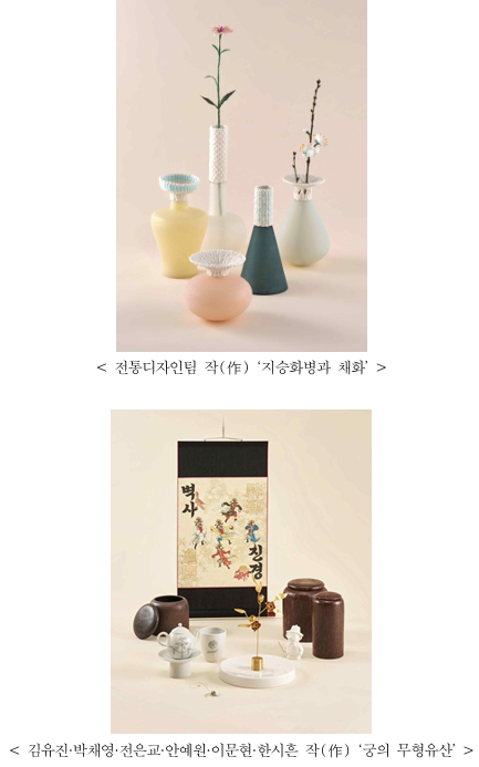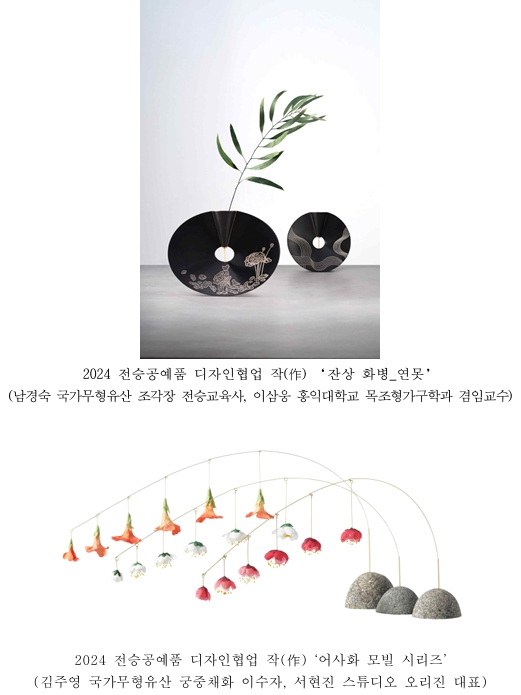 | 전시에는 둥근 형태의 두루 주머니를 금박과 백금박으로 화려하게 제작한 ‘가죽 금박 두루주머니’(박수영 국가무형유산 금박장 이수자, 김주일 디자인주 대표), 반으로 접어 두 가지 방식으로 사용할 수 있도록 제작된 ‘누비 가방’(하은정 국가무형유산 누비장 이수자, 김현지 원이어퍼포먼스 대표), 은 상감으로 장식한 ‘잔상 화병_연못’(남경숙 국가무형유산 조각장 전승교육사, 이삼웅 홍익대학교 목조형가구학과 겸임교수), 어사화를 탁상용 흔들개비(모빌)로 재탄생시킨 ‘어사화 모빌’(김주영 국가무형유산 궁중채화 이수자, 서현진 스튜디오 오리진 대표) 등 무형유산 전승자와 현대공예가가 협업한 재미있고 참신한 전승공예품들을 만날 수 있다. * 어사화: 조선 때, 문무과의 급제자에게 임금이 내리던 종이꽃