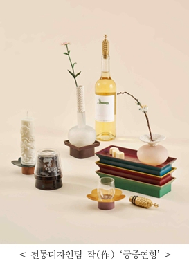 | 한국전통문화대학교 창의인재지원센터 전통디자인팀은 한 해 동안 전통미술공예학과 대학원생과 전통디자인팀이 기획 개발한 제품들을 선보이는 ‘1795 연향, 2024 파티’ 전시를 개최한다. (12.12.~15.) 전시에는 조선왕실의 잔치, 연향 속의 문화유산들을 오늘날 모임이나 파티에서도 쓸 수 있는 제품으로 제작한 작품들이 출품돼 관람객의 흥미를 돋운다. 전통공예와 3차원(3D) 기법을 활용한 화병, 현대적으로 재해석한 향초, 술잔 등 총 21품목 66점을 소개한다. 손님을 융숭하게 대접하던 조선왕실의 잔칫상과 문양, 공경과 복을 부르는 춤과 화려한 장식, 잔치가 펼쳐지는 궁의 정원을 현대적으로 만나는 이색적인 즐거움도 경험할 수 있다. 전시 기간 한정으로 일부 전시품은 구매도 가능하며, 행사 기간 내 전시장 방문객 중 전통디자인팀 인스타그램(@nuchcraftlab)을 구독한 뒤 인증하면 특별 제작된 기념품(잠화배지)도 증정한다. * 잠화: 궁중연향에 참석한 손님들의 머리에 꽂던 장식
