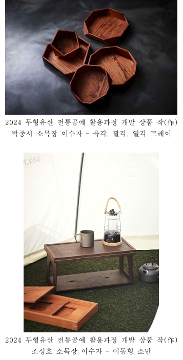 국립무형유산원은 <2024년 무형유산 전통공예 활용 교육과정>을 통해 제작된 공예상품 15종을 선보인다.(12.12.~15.) 박종서·조성호(소목장 이수자), 임경미(불화장 이수자), 김규태(제와장 이수자), 박미양(침선장 전수생)까지 총 5명의 전승자가 제작한 다각형 쟁반(트레이), 이동형 소반, 다각형 전돌 문진, ‘솟을 금’ 문양(불교미술에서 평화의 연속성과 연결을 의미)이 새겨진 카드지갑 등 전통공예의 감성과 현대적 디자인을 결합한 여러 공예상품을 만날 수 있다. * 전돌: 왕궁, 사찰, 왕릉 따위의 벽이나 바닥을 장식하는 데 쓰던 벽돌 * 문진: 책장이나 종이가 바람에 날리지 않도록 눌러두는 물건