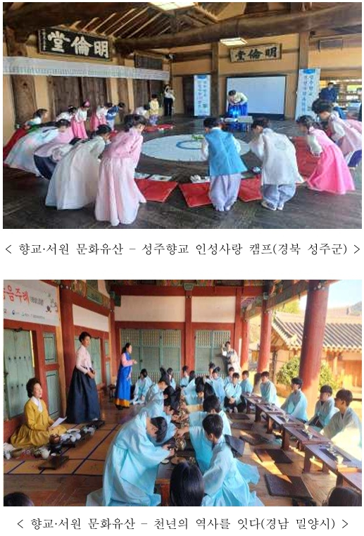 ‘향교·서원 문화유산 활용’ 부문에서는 ▲ 서원의 특성과 이야기를 중심으로 고품질의 프로그램을 구성·운영한 「무양 in the city(광주 광산구)」, ▲ 지자체, 수행단체, 향교 관계자가 협력하여 진정성 있는 프로그램을 기획한 「성주향교 인성사랑(愛)캠프(경북 성주군)」, ▲ 지역의 기획자와 예술가 간 협업을 통해 지역의 역사적 인물을 다룬 뮤지컬을 선보인 「천년의 역사를 잇다(경남 밀양시)」 등 4개 사업이 선정되었다.