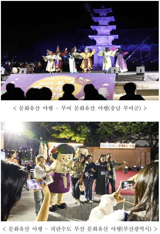 | ‘문화유산 야행’ 부문에서는 ▲ 어려움 속에서도 피란수도로서 희망과 회복의 가치를 일궈낸 부산의 역사를 입체적이고 생생하게 경험할 수 있도록 한 「피란수도 부산 문화유산 야행(부산)」, ▲ 백제대향로 속 오악사의 복식과 악기를 재현한 「부여 문화유산 야행(충남 부여군)」, ▲ 백제왕궁박물관 내 공연, 백제 및 왕궁리 유적에 관한 전시 등 40여 개의 프로그램을 다양하게 선보인 「익산 문화유산 야행(전북 익산시)」 등 3개 사업이 선정되었다.