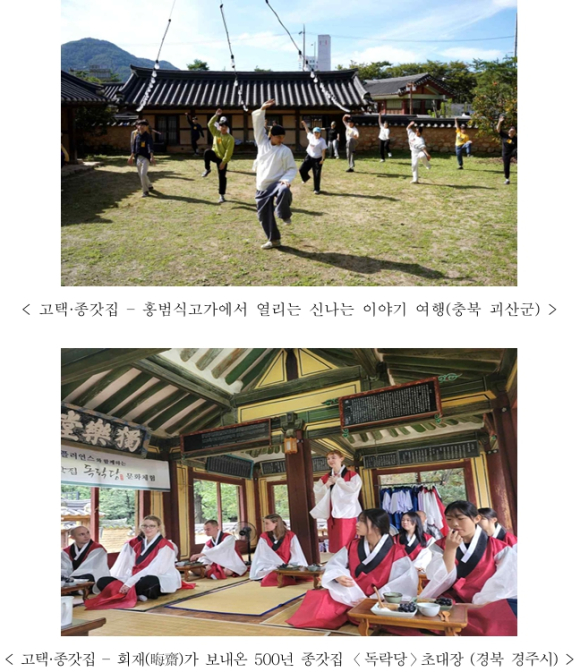 | ‘고택·종갓집 활용’ 부문은 ▲ 남양주 궁집이 지닌 역사, 문화적 특성을 현대적으로 해석하여 가례 체험, 답사, 교육을 운영한 「영조의 막내딸 화길옹주가 보내온 청첩장(경기 남양주시)」, ▲ 홍범식 고가의 이야기를 공간과 유기적으로 연결한 「홍범식고가에서 열리는 신나는 이야기 여행(충북 괴산군)」, ▲ 종손과 종부가 함께 프로그램을 기획·진행하여 살아있는 종가문화를 체험하도록 한 「회재(晦齋)가 보내온 500년 종갓집 〈독락당〉초대장(경북 경주시)」의 3개 사업이 선정되었다.