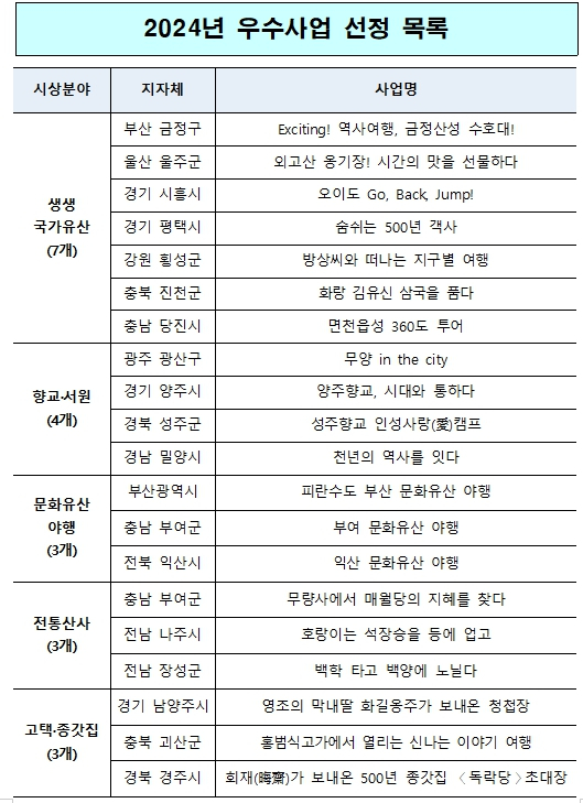 올해의 국가유산 활용 우수사업 20건 선정해 시상