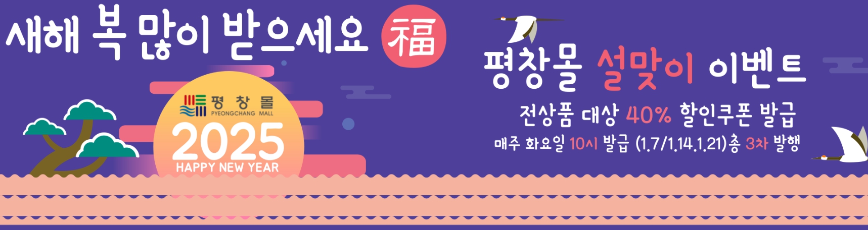 평창군이 운영하는 ‘평창몰’이 다가오는 설 명절을 맞아 특별 온라인 기획전을 연다. 이번 기획전은 지역 농·특산물 판매 활성화와 입점 기업의 매출 증대를 목표로 2025년 1월 2일부터 31일까지 한 달간 진행된다. 평창몰은 이번 기획전에서 회원 고객을 대상으로 최대 40% 할인쿠폰을 제공한다. 쿠폰은 기획전 기간 매주 화요일(1월 7일, 14일, 21일) 오전 10시에 발급되며, 1만 원 이상 구매 시 최대 4만 원까지 할인받을 수 있다. 할인 쿠폰은 선착순으로 제공되며, 예산 소진 시 조기 종료될 수 있다.