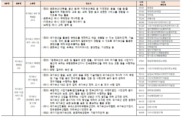 국가유산 산업 특수분류는 한국표준산업분류(KSIC) 코드와 연계하여 4개 대분류(▲ 국가유산 보존·관리업, ▲ 국가유산 제품 제조업, ▲ 국가유산 여가·매매·기타 서비스업, ▲ 국가유산 교육 서비스업), 11개 중분류, 21개 소분류 등 3개 계층 구조로 구성된다. * 한국표준산업분류: 통계작성기관이 동일한 기준에 따라 통계를 작성할 수 있도록 유엔(UN)이 권고하고 있는 국제표준산업분류를 기초로 통계청장이 작성한 통계목적의 분류