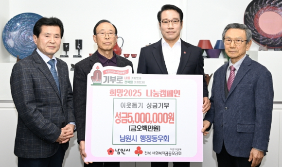남원시는 1월 16일 남원시 행정공무원 퇴직자 모임인 행정동우회(회장 이광우)에서 희망2025나눔캠페인을 맞아 자체적으로 모금한 성금 5백만 원을 기부했다고 밝혔다.