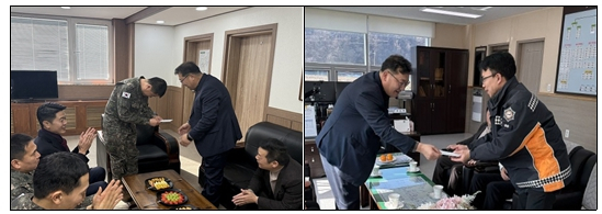 ....................................【미 담 사 례】..................................... □ 평창읍방위협의회, 명절 맞이 유관기관 위문 실시 ੦ 지난(1.24.), 평창읍방위협의회(의장 김용필)는 육군 제8087부대 1대대를 방문하여 군 장병들의 노고를 격려하고, 지역 주민의 안전을 위해 헌신하는 평창119안전센터를 방문하여 근무자를 격려하며 소정의 위문금을 전달하였음.