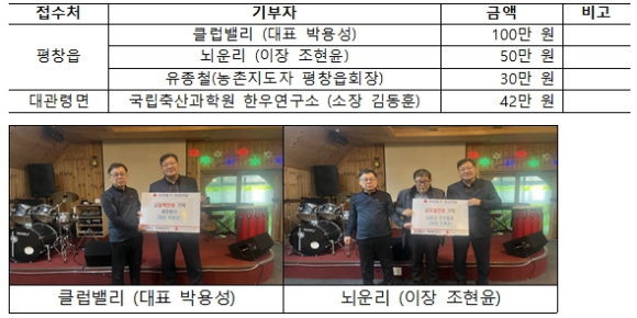 | □ 평창읍 상리 마을회, 주택화재 피해 가구 복구지 원금 100만원 전달 ੦ 지난(1.24.), 평창읍 상리 마을회(이장 이경수)는 지난 15일 발생한 상리 주택화재 피해 가구의 조속한 일상 복귀를 기원하며 복구 지원금 100만원을 전달하였음.