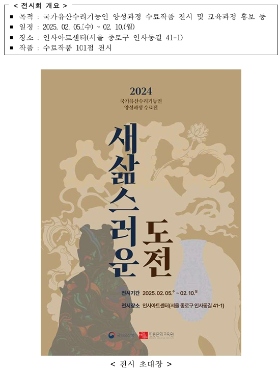 미래 국가유산수리기능 인재들의 역량 담긴 101점의 작품 전시- 「국가유산수리기능인 양성과정 수료전」 개최(2.5.~2.10, 서울 인사아트센터 1층 본 전시장)이광훈 기자 / |