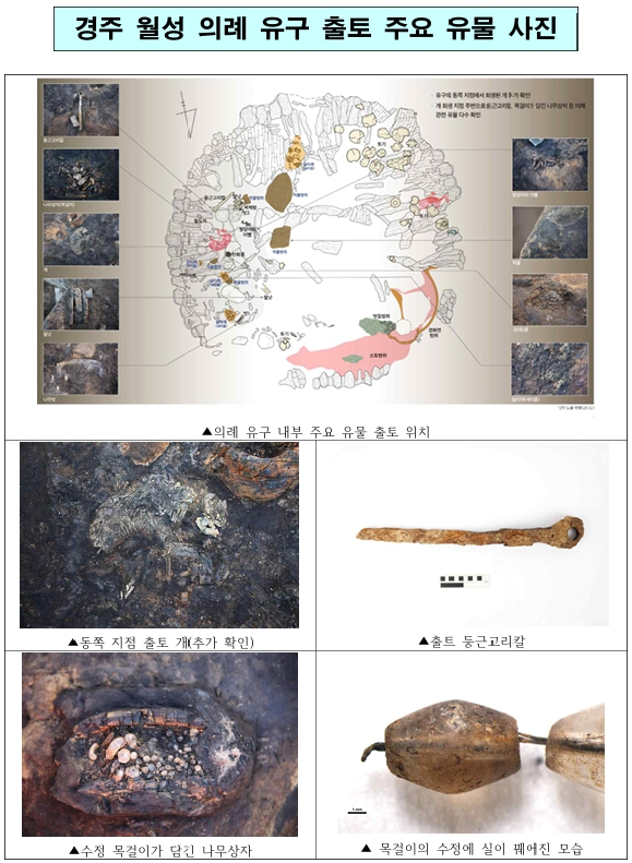 국립경주문화유산연구소는 지난해 10월 의례 제물로 바쳐진 개를 공개한 이후 12월까지 진행된 추가 조사에서 개 한 마리를 더 확인했으며, 그 주변에서 수정 목걸이가 담긴 나무상자와 둥근고리칼, 상어 이빨과 함께 1,200여 알이나 되는 콩들도 더 발굴했다. * 사로국 시기: 진한 12국 중 하나로서, 경주 일대에 형성된 초기국가 단계(서기전 1세기~서기 4세기 중엽)
