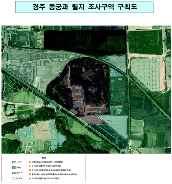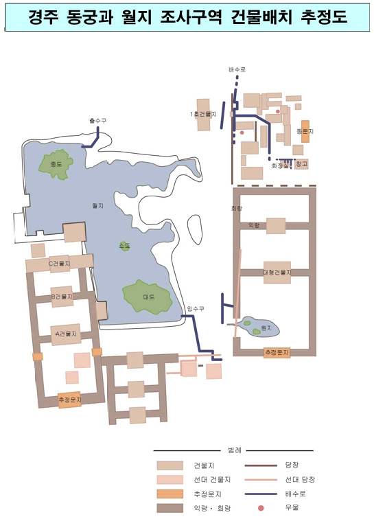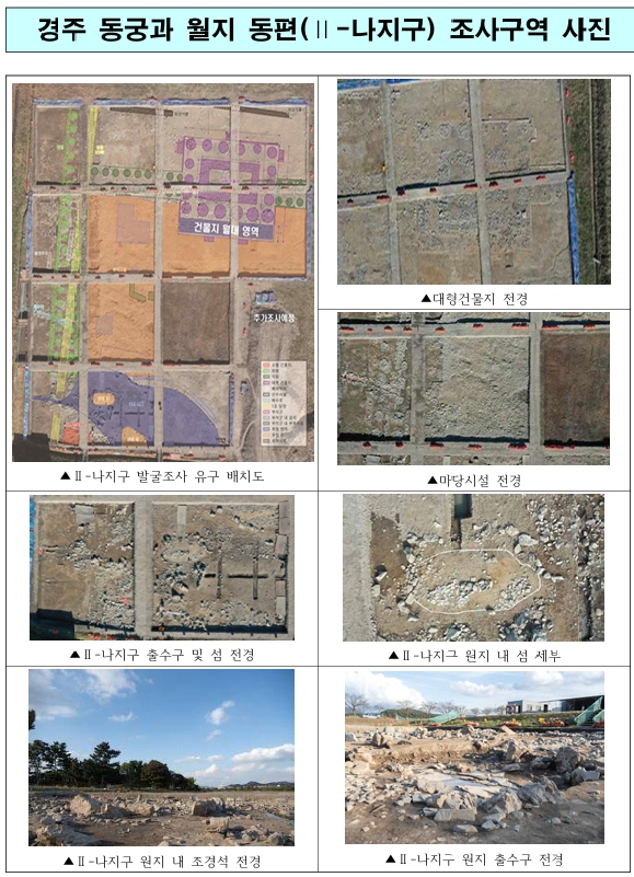 | 기존에 동궁으로 추정했던 곳(월지 서편)은 월성의 동쪽에 위치하여 동궁으로 인식되기도 하였다. 그러나 주변보다 높게 조성된 대지 위에 위치하고, 건물 자체의 위계도 높은 점 등으로 동궁으로 확정짓기는 어려웠다. 그런데 최근 조사로 월지 동편에서 서편보다 한 단계 낮은 위계의 건물을 추가로 확인함에 따라 이 월지 동편 건물지를 동궁으로 보고, 당초 동궁으로 추정했었던 월지 서편 건물지는 왕의 공간으로 보는 것이 타당하며, 이 두 공간이 각각 독립적으로 운영되었다는 사실도 확인할 수 있었다. 월지 동편에서 동궁으로 새롭게 확인된 곳(Ⅱ-나지구)에서는 복도식 건물에 둘러싸인 건물지와 그 앞에 펼쳐진 넓은 마당시설, 내부에 별도로 조성된 원지(정원 안의 못)가 함께 확인되었다. 또한, 이 동궁의 원지가 기존 ‘동궁과 월지’와 연결되지 않고 별도로 운영되어 독립된 배수 체계를 갖춘 사실도 밝혀내었다. * Ⅱ-나지구 건물지: 정면 5칸(25m)×측면 4칸(21.9m), 내부의 기둥을 없앤 감주(減柱)시설, 일정시점 월대 공간 증축(기둥 이동 흔적 확인), 계단지 5개소 확인 * 원지 : 양식이나 모양이 일정하지 않은 정원 안의 못으로, 보통 건물지 앞에 위치함.