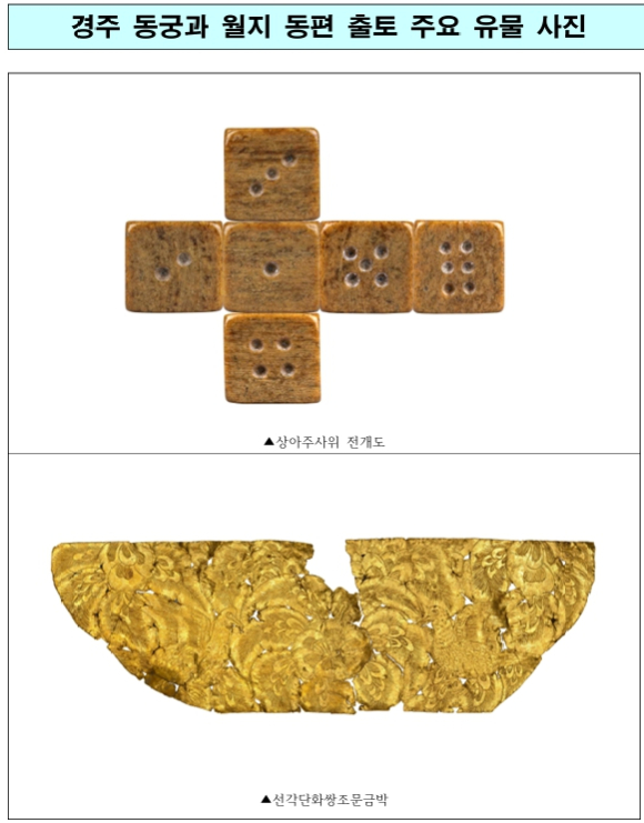 | 이러한 사실을 통해 신라인들의 토목기술과 함께 현재까지 알려진 ‘동궁과 월지’를 완전히 새롭게 이해하는 계기가 마련될 것으로 기대된다. 마지막으로 ‘공예 및 예술품(디테일)’ 발표에서는 앞서 월지 주변의 출토 유물로만 알려진 바 있으나 이번에 ‘진짜 동궁’이 발견됨에 따라 출토 위치가‘진짜 동궁’의 북쪽 생활공간으로 확인된 상아 주사위(2017), 선각단화쌍조문금박(2022)의 특수성을 재조명해본다. 동궁의 생활공간에서 출토된 만큼 최고 수준의 고급 놀이기구와 신라 공예문화를 대표하는 유물들을 통해 태자가 기거한 동궁에서의 일상을 들여다보는 것도 의미가 있을 것이다. 이번 성과 공개회에 대한 자세한 내용은 국립경주문화유산연구소(☎054-778-8716)로 문의하면 된다.