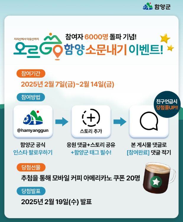 참여는 함양군의 공식 인스타그램 계정에서 ‘오르GO 함양’ 관련 홍보 게시물을 공유하고 댓글을 남기면 응모할 수 있으며, 19일(수) 추첨을 통해 선정된 50명에게 모바일 커피 쿠폰이 제공된다.