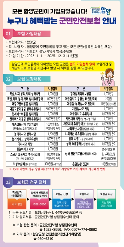 함양군, 군민 대상 2025년 군민안전보험 가입군민이면 누구나 혜택받는 군민안전보험 운영, 최대 2,000만 원 보장정유근 기자 / |