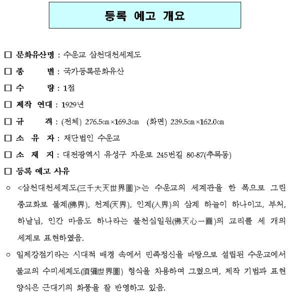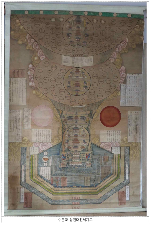 이번에 등록 예고한 「수운교 삼천대천세계도」는 불교의 수미세계도의 형식을 빌려 민족종교인 수운교의 세계관을 상·중·하 3단으로 표현한 종교화이며, 수운교의 교리로 평가된다. * 수운교(水雲敎) : 1923년에 창시된 민족종교로, 동학의 창시자인 최제우(崔濟愚, 1824~1864)의 호 수운(水雲)에서 따온 명칭임 * 수미세계도(須彌世界圖) : 불교의 수미산을 중심으로 한 우주관을 표현한 종교화