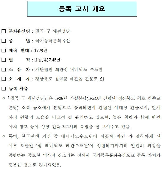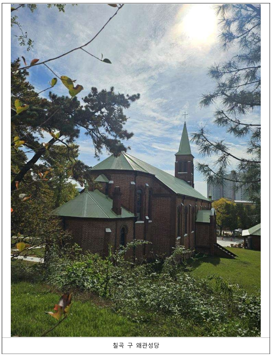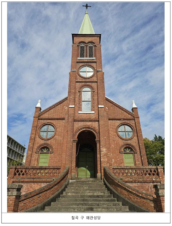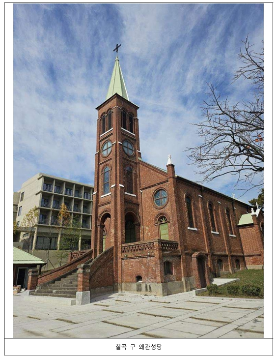 | 「칠곡 구 왜관성당」은 1928년 가실본당(1924년 건립된 경상북도 최초 천주교 본당) 소속 공소에서 본당으로 승격되면서 건립된 예배당 건물로, 높은 첨탑과 반원아치 창호 등 성당 건축의 특징을 현재까지 잘 유지하고 있다. 선교활동을 펼치던 독일 성 베네딕도회의 수도자들이 한국전쟁 기간 중 이곳에 피난을 와서 세운 ‘베네딕도수도원’이 오늘날의 ‘성 베네딕도 왜관수도원’으로 성립되는 과정을 보여주는 중요한 역사적 장소라는 점에서도 충분한 가치가 있다. * 본당: 주임 신부가 상주하는 성당 * 공소: 본당보다 작은 단위로, 주임 신부가 상주하지 않는 예배소나 그 구역