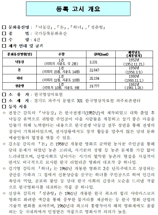 한편, 이번에 등록된 문화유산은 「칠곡 구 왜관성당」과 영화 「낙동강」, 「돈」, 「하녀」, 「성춘향」까지 총 5건이다.