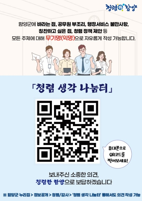 함양군, 군민과 함께하는 ‘청렴 생각 나눔터’ 운영함양군 누리집 또는 휴대전화 정보무늬(QR코드)를 통해 무기명(익명)으로 참여 가능이광훈 기자 / |