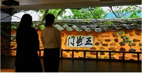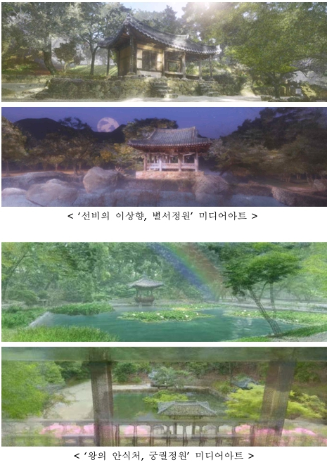 ▲ 3부 ‘인지제의(因地制宜), 자연에 의탁한 정원’에서는, 도심 속 전통정원인 창덕궁 후원의 사계와 명승으로 지정된 네 곳의 별서정원 「보길도 윤선도 원림」, 「담양 소쇄원」, 「담양 명옥헌 원림」, 「화순 임대정 원림」을 직접 거닐어 보는듯한 체험을 할 수 있다. 특히, 두 미디어아트는 그래픽으로 구현된 미디어아트와 달리 실존하는 정원을 실측한 정밀데이터를 활용했다는 점에서 차별성을 지닌다. * 별서정원(別墅庭園) : 자연에 귀의하여 전원이나 산속에 따로 집을 지어 유유자적한 생활을 즐기려고 만든 정원