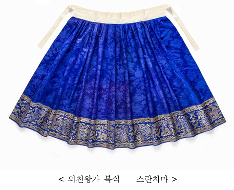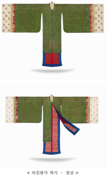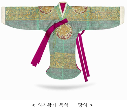 | 「의친왕가 복식」은 왕실 여성의 예복 중 겉옷인 원삼(圓衫)과 당의(唐衣) 및 스란치마, 머리에 쓰는 화관(花冠), 노리개, 그리고 궁녀용 대대(大帶, 허리띠)로 구성되어 있으며, 유래가 명확하고 착용자의 지위에 따른 궁중복식의 특징과 다양성을 보여 주는 실물 자료로서 높은 학술적·예술적 가치를 지녔다. * 원삼: 궁중과 반가 여성이 예복으로 착용했던 길이가 긴 겉옷으로, 앞자락이 짧고 뒷자락이 길며 양옆이 트였음. 넓은 소매에 색동과 흰색 한삼이 달림. * 당의: 궁중과 반가 여성이 예복으로 착용했던 겉옷으로, 원삼과 같이 겨드랑이 아래부터 양옆이 트였음. * 스란치마: 예복용 치마로 원삼 및 당의 등과 함께 갖추어 입음. 부금 또는 직금(織金)으로 장식한 스란단이 부착되어 있음. * 대대: 원삼 위에 두르는 허리띠로, 왕실용은 홍색 비단에 봉황문, 궁녀용은 남색 비단에 화문으로 장식