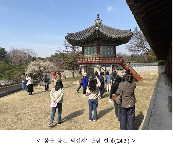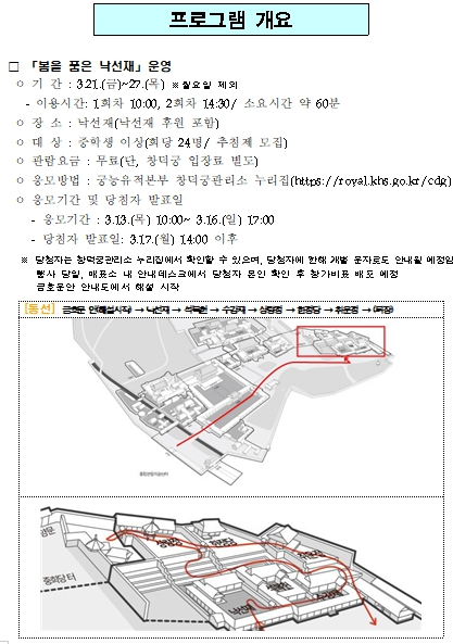 - ‘봄을 품은 낙선재’(3.21.~27, 오전 10시/오후 2시 30분) 운영 / 추첨제 응모(3.13.~16.)