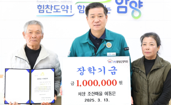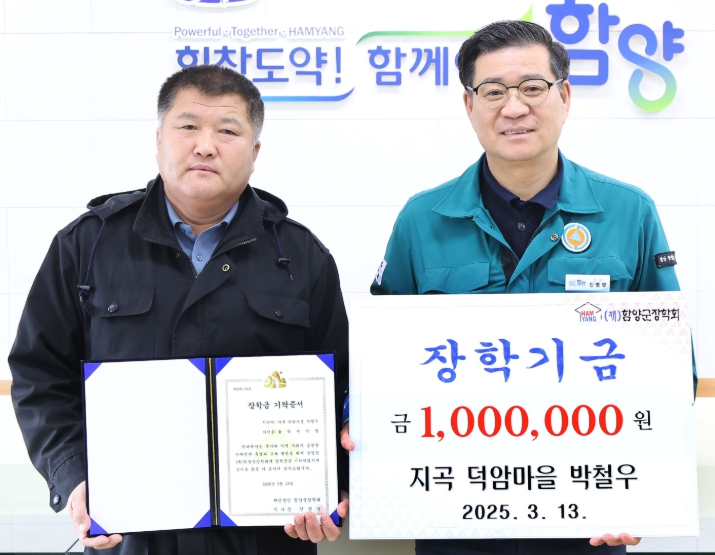 함양군, 따뜻한 나눔으로 이어지는 장학금 기탁 행렬지곡 덕암마을 박철우·서상 조산마을 이동은 100만 원 기탁한용택 기자 / |